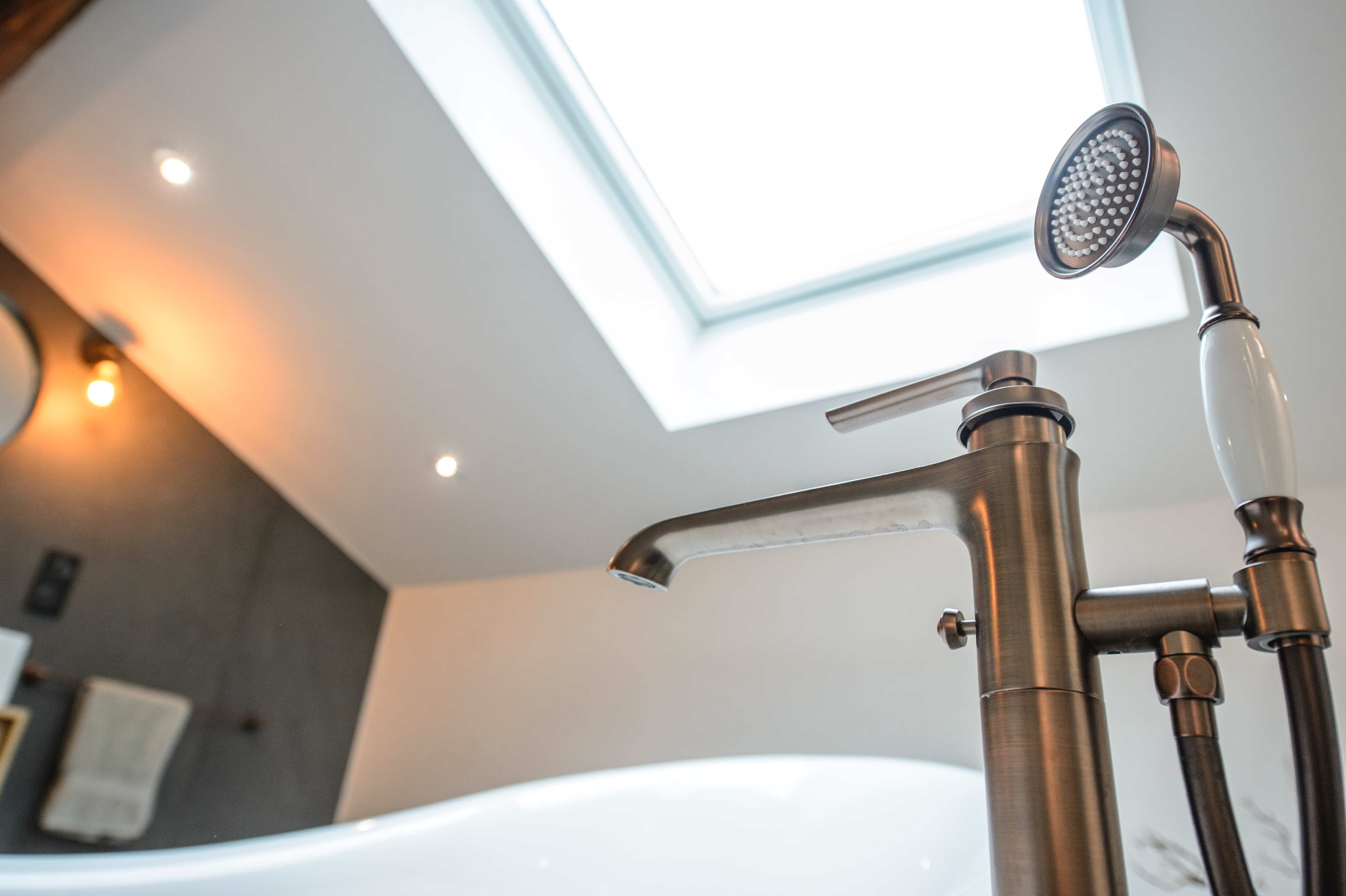 Sous le velux, véritable puit de jour, l’occasion ne devait pas être ratée d’installer une belle baignoire sur pieds.