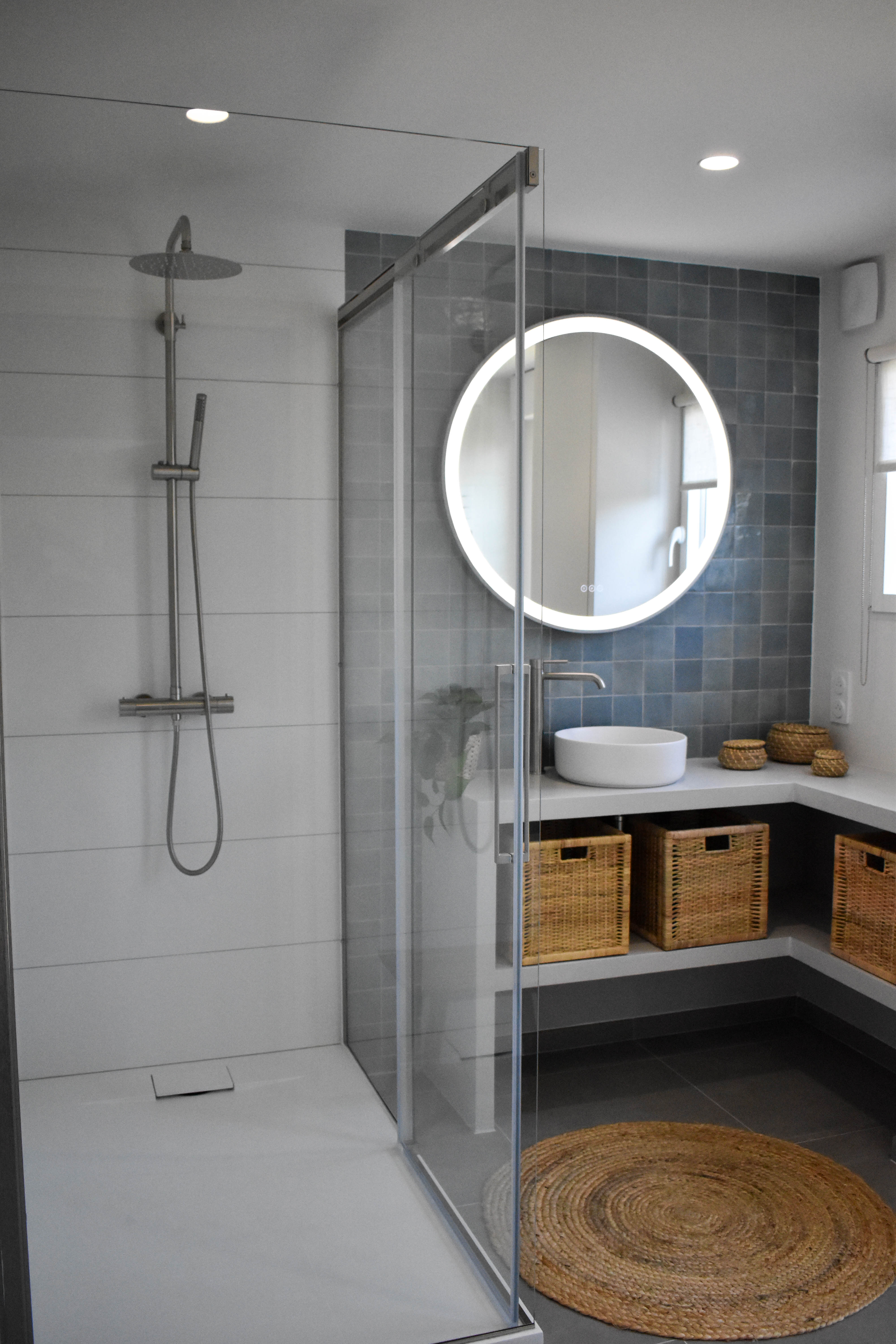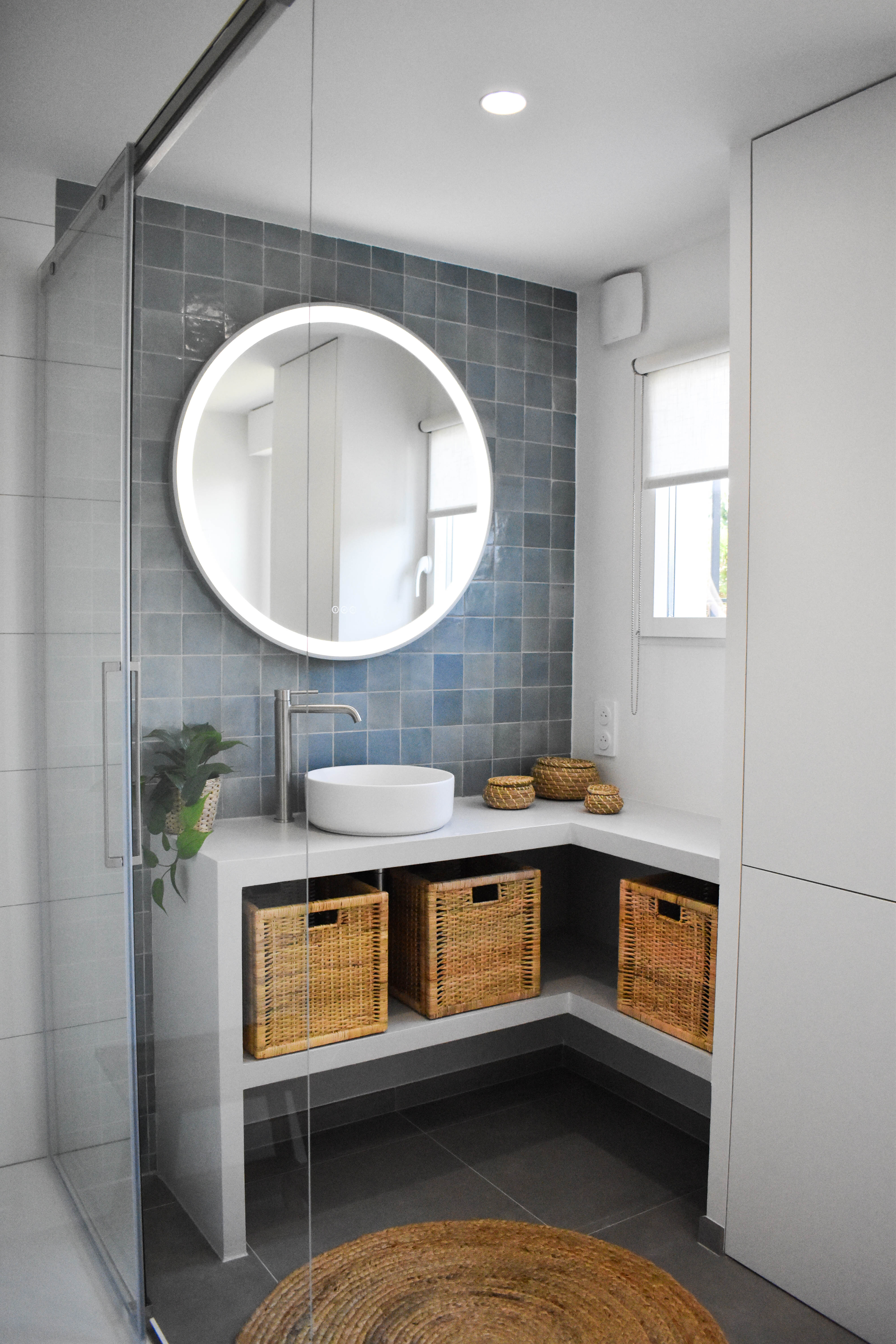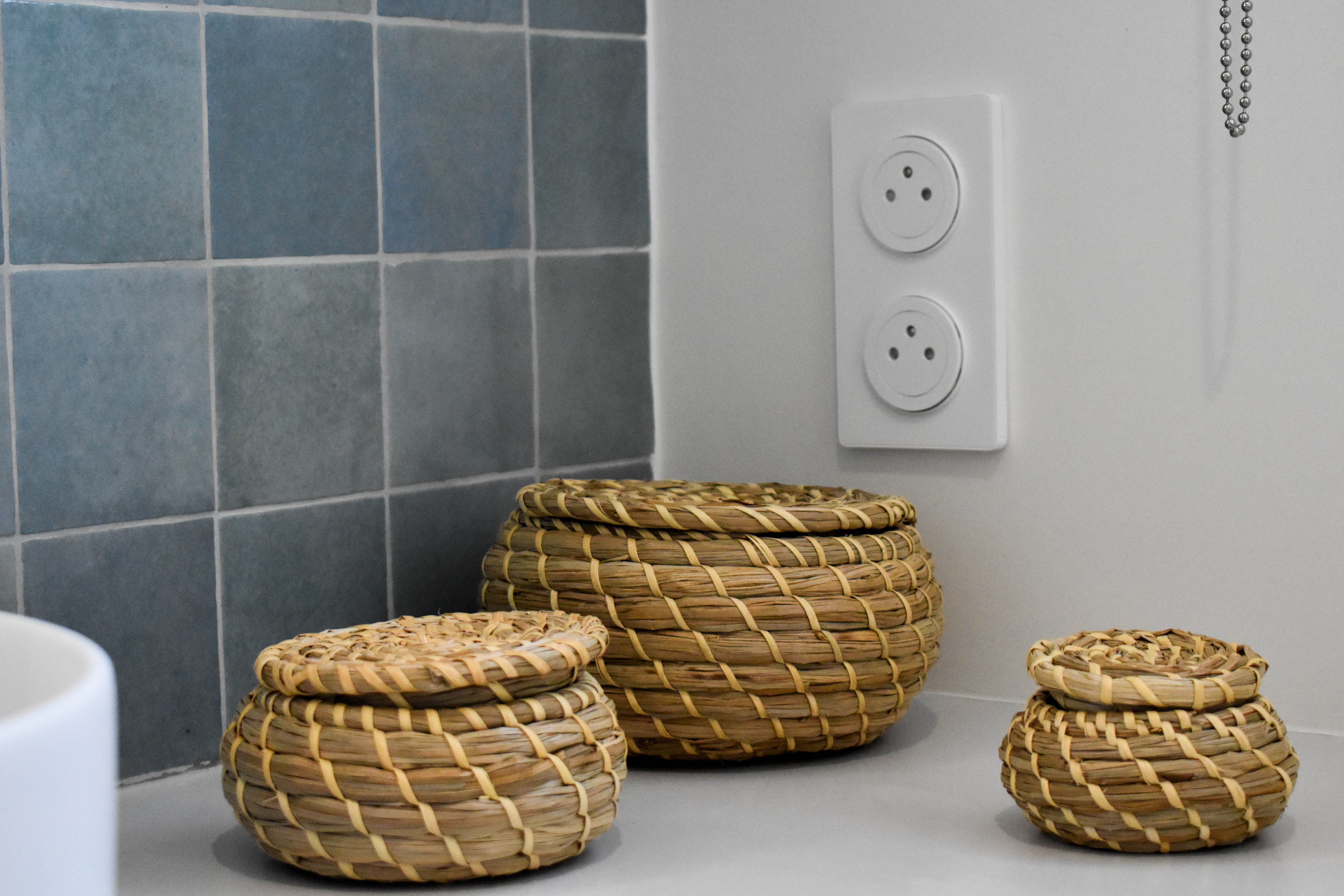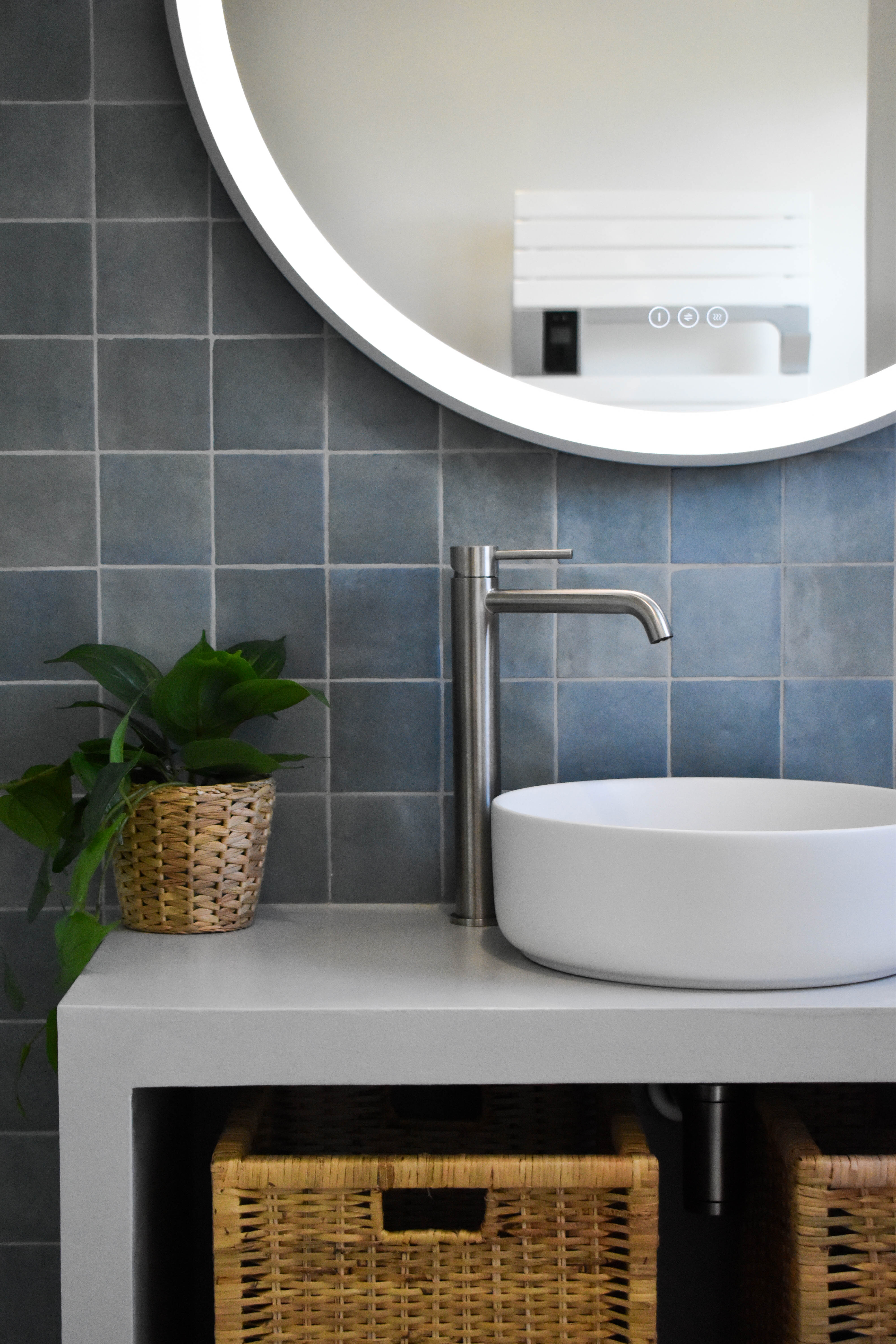 Le choix des matériaux s’est orienté vers des teintes neutres et naturelles, propices à la détente. Le carrelage mural, aux nuances gris bleutées, confère une touche d’authenticité et de profondeur à l’ensemble, tout en jouant avec la lumière. Le contraste entre la céramique blanche de la vasque et la texture légèrement irrégulière du carreau crée un équilibre subtil entre modernité et artisanat. Les rangements en fibres naturelles apportent une note chaleureuse et complètent l’espace avec douceur.