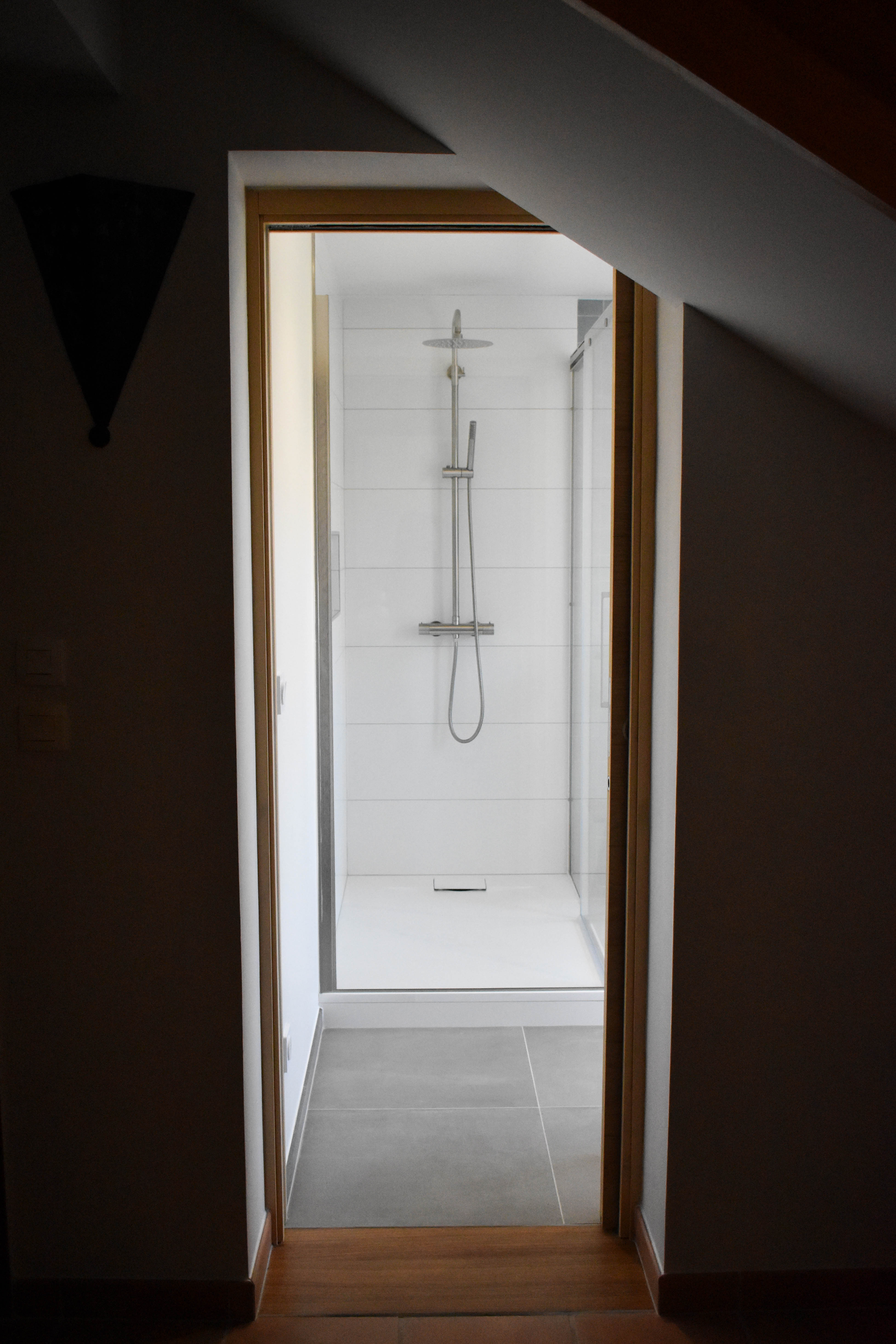 Les travaux ont permis de redonner vie à cette pièce en repensant entièrement sa structure et ses accès. L’ancienne porte qui donnait sur l’extérieur, a été déposée puis remplacée par un mur plein, afin de condamner l’accès et d’assurer une parfaite isolation thermique et acoustique. Du côté intérieur, la porte reliant la maison a été remplacée par une porte coulissante, afin de libérer l’espace et d’offrir une circulation fluide. Cette modification a permis d’optimiser chaque mètre carré, élément essentiel pour créer une salle de bain confortable et bien proportionnée.