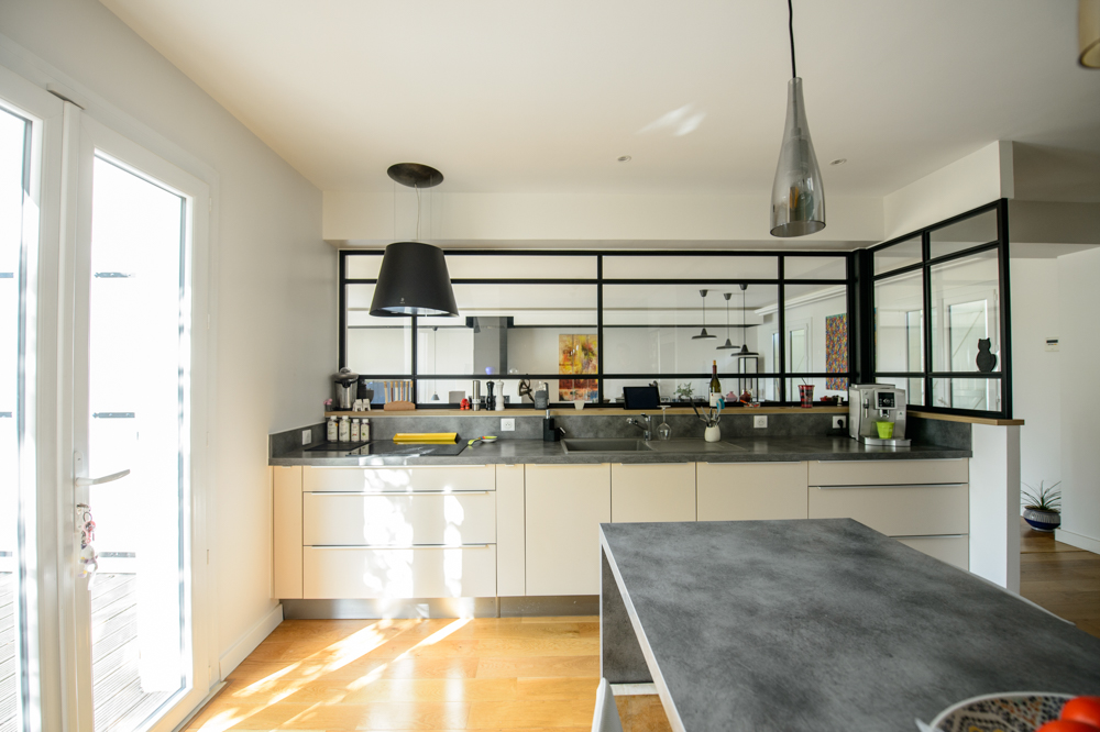Cette verrière a été conçue de façon à être plus contemporaine, les carreaux vitrés sont plus rectangulaires qu’en temps normal et proposent une plus large vision entre les deux espaces à vivre.