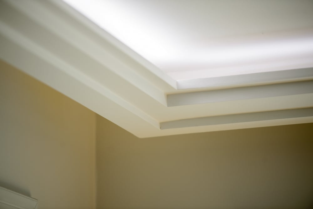 Des corniches en staff en périphérie de la pièce de vie ont été posées et un éclairage indirect a été positionné à l’intérieur pour apporter plus de cachet « déco » à l’ambiance de la pièce.