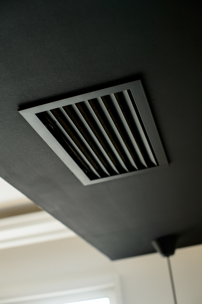 La partie technique de ventilation de la cheminée a permis d’intégrer des grilles très discrètes, peintes en noir et fondues dans la sous face de la retombée de placo. Cette retombée a également permis d’accrocher des suspensions au niveau du coin TV.