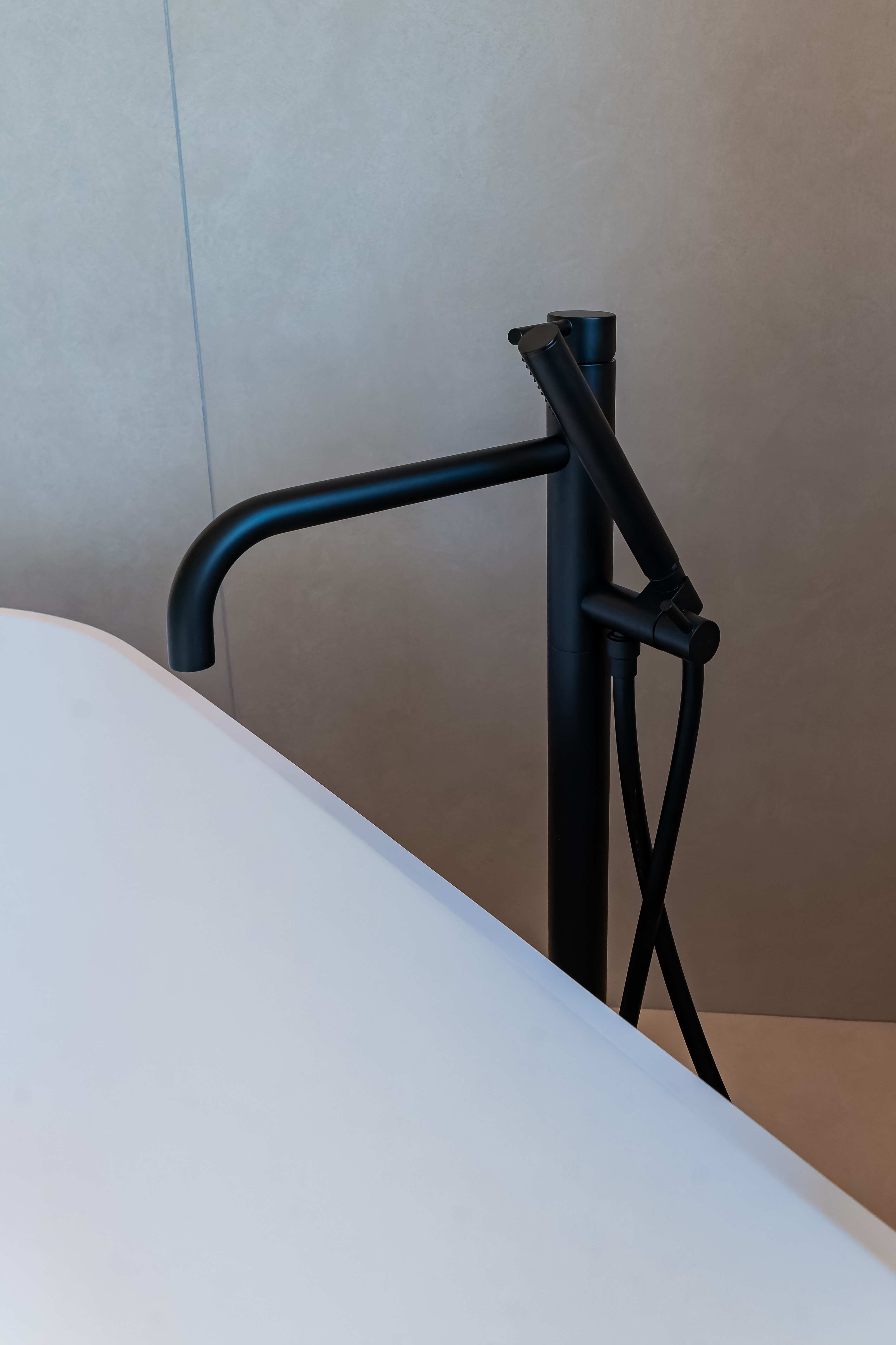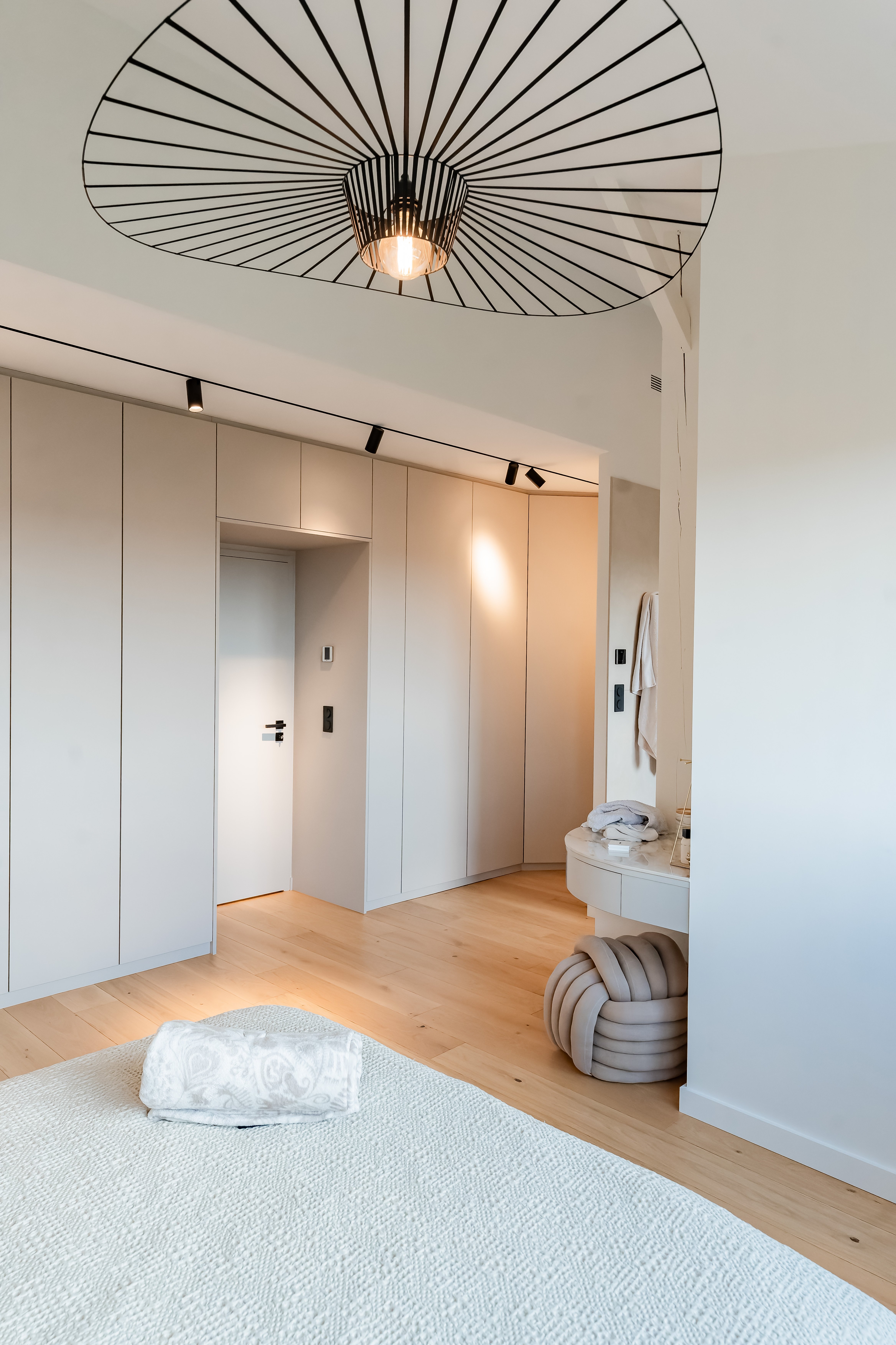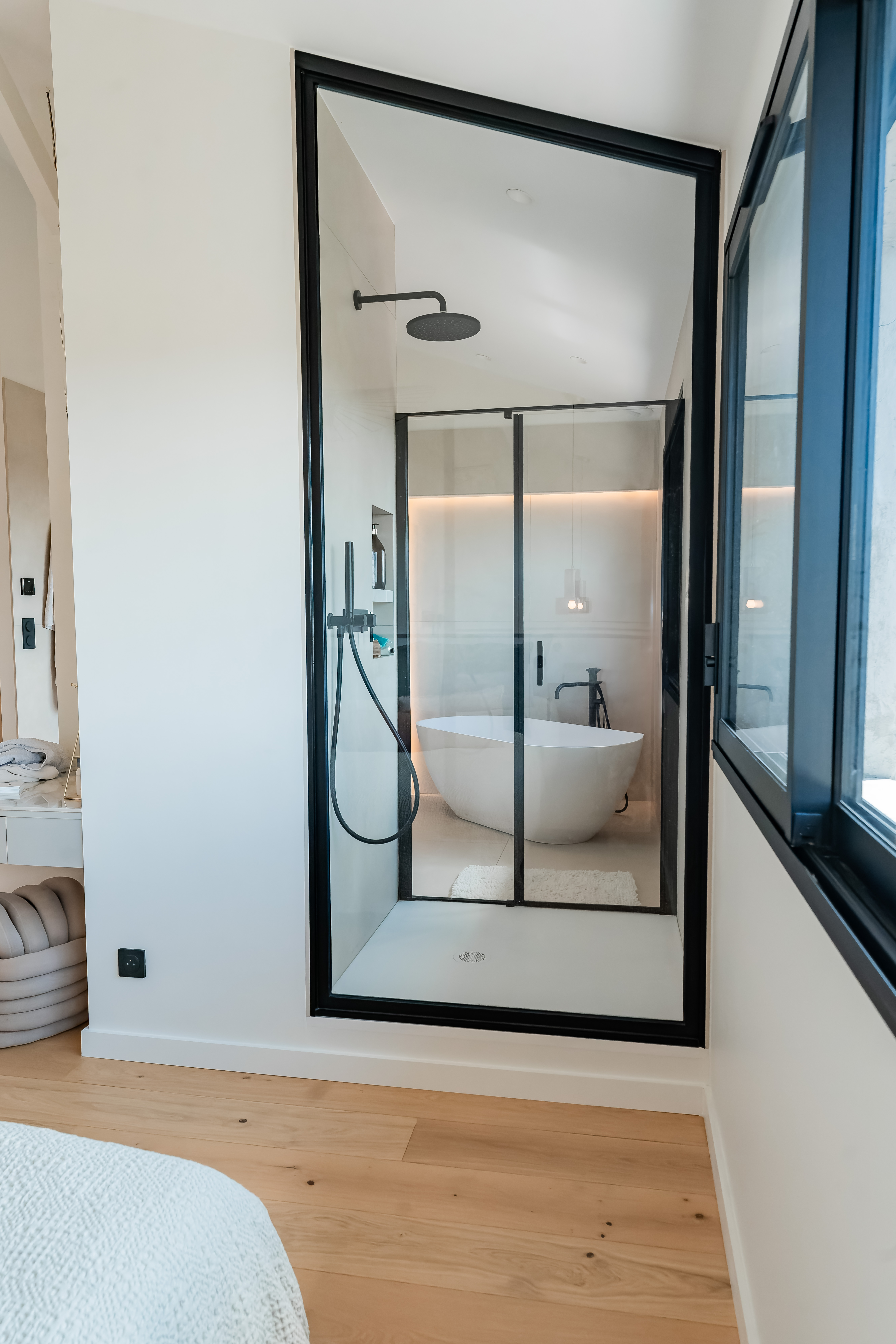 À l’étage, la suite parentale a été entièrement transformée. En supprimant le faux plafond, nous avons redonné du volume et de la hauteur, créant une atmosphère aérienne et apaisante. L’espace s’ouvre sur une salle de bain intégrée, où une baignoire îlot occupe une place centrale et se distingue comme une véritable pièce d’architecture. Le mobilier aux lignes fines et le jeu d’éclairage indirect apportent une douceur enveloppante. Un coin coiffeuse en pierre, accompagné d’un siège au design raffiné, complète cet espace intime pensé comme un cocon.