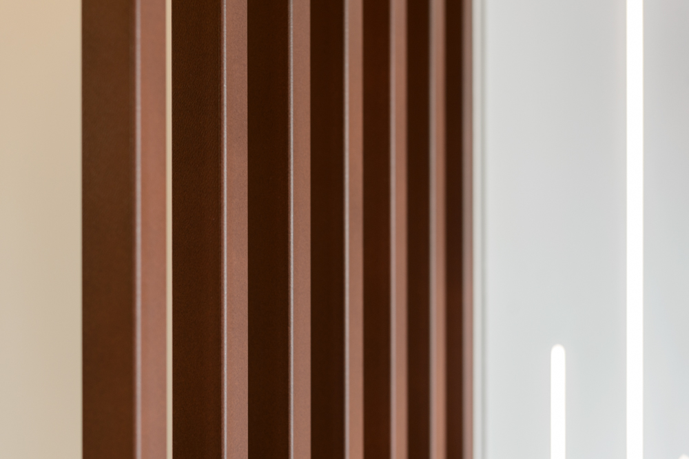Nous avons séparé visuellement les espaces par le biais d’un claustra en métal aux aspects rouillés pour être en harmonie avec la brique du lieu. Ce claustra simule une arche de passage d’une pièce à l’autre, tout en permettant de garder le côté traversant.